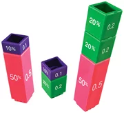 Il set comprende 51 blocchi, ciascuno contrassegnato da vari valori matematici, tra cui percentuali, valori decimali equivalenti e frazioni. La loro costruzione colorata favorisce la visualizzazione e aiuta a comprendere il concetto di frazione. La possibilità di costruire semplici modelli matematici rende più facile per gli studenti sperimentare e scoprire le relazioni tra le frazioni.