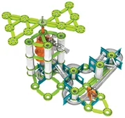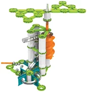 Geomag Mechanics Gravity RE Vertical Motor dimostra come la forza di gravità possa essere utilizzata per creare modelli in movimento e fantastiche piste per sfere di metallo. La rotazione manuale delle eliche è il primo passo per attivare il motore che aziona l'intera struttura, offrendo un'affascinante lezione di fisica.
