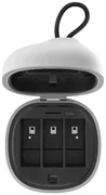 Il caricabatterie presenta un design elegante ma funzionale. Permette di riporre 3 batterie e 3 schede TF. Pesa solo 147,6 g e grazie alle sue dimensioni compatte puoi metterlo facilmente nello zaino o nella borsa. Puoi trasportare facilmente il dispositivo con un cordino corto, con il quale puoi attaccarlo alla borsa o appenderlo al dito. Inoltre, il grado di impermeabilità IP54 significa che non devi preoccuparti di schizzi accidentali del caricabatterie.