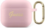 Custodia in silicone GUESS. La custodia in silicone protegge la docking station per cuffie wireless Apple AirPods da danni alla superficie e possibili perdite. La custodia in silicone di alta qualità si adatta perfettamente alla custodia originale degli AirPods 3 ed è estremamente piacevole al tatto. Il tutto è completato dal caratteristico logo Guess dorato che fa sì che la custodia assuma uno stile elegante. Sul lato della custodia è presente un pratico anello in oro che permette di agganciare la custodia ad esempio al guinzaglio.
