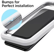 Il vetro temperato AlignMaster di Spigen è stato fissato con un taglio perfetto sulla parte anteriore del telefono con una cornice di montaggio, che consente di posizionarlo perfettamente sullo schermo. Il produttore ha semplificato il metodo di assemblaggio al punto che è completamente intuitivo per ogni utente.