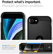 La forma leggermente rialzata della custodia intorno alla fotocamera e allo schermo la protegge dai graffi facendo passare il telefono appena sopra la superficie piana. Ha coperchi dei pulsanti e ritagli per le porte.