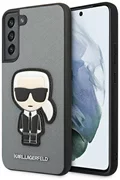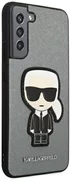 La custodia è realizzata in ecopelle saffiano di alta gamma e decorata con una toppa con la figura di Karl Lagerfeld che si riferisce al leggendario designer.