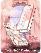 Una sottile forma di protezione corazzata è una custodia Supcase Cosmo. L'alloggiamento è stato realizzato con due materiali complementari: TPU ammortizzante e policarbonato rinforzato. Questo design, nonostante le dimensioni ridotte rispetto alle custodie per armature convenzionali, consente uno smorzamento efficace di cadute estreme. Inoltre, il pannello frontale ha una cornice che consente non solo di separare lo schermo nella posizione diretta del telefono con il display sulla superficie piana, ma protegge anche la parte anteriore del telefono dai graffi quando cade su irregolarità.