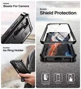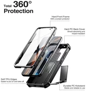 La custodia in due pezzi combina un'armatura rigida indossata sul retro, realizzata con rivestimento in PC e TPU resistente agli urti. Un ulteriore rinforzo negli angoli - cuscini d'aria protettivi - attutisce efficacemente qualsiasi caduta. La parte anteriore del dispositivo è circondata da una cornice con copertura in policarbonato integrata. Questa soluzione separa perfettamente il display e lo protegge dai graffi.