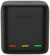 Nonostante il design a tre canali, il caricabatterie TELESIN è compatto e non occupa molto spazio nello zaino. Gli slot integrati per le schede TF e le batterie facilitano l'organizzazione dell'attrezzatura. Il dispositivo è dotato di una porta USB-C, che elimina la necessità di adattatori aggiuntivi e consente la ricarica da diverse fonti, come powerbank, laptop o caricabatterie da auto.
