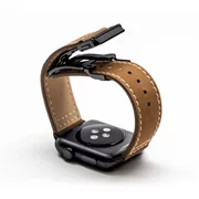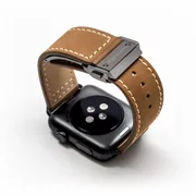 Luxury interchangeable brown Monowear Leather Strap with adaptors and matte aluminum clasp in dark gray color for Apple Watch size 42 - 44mm.